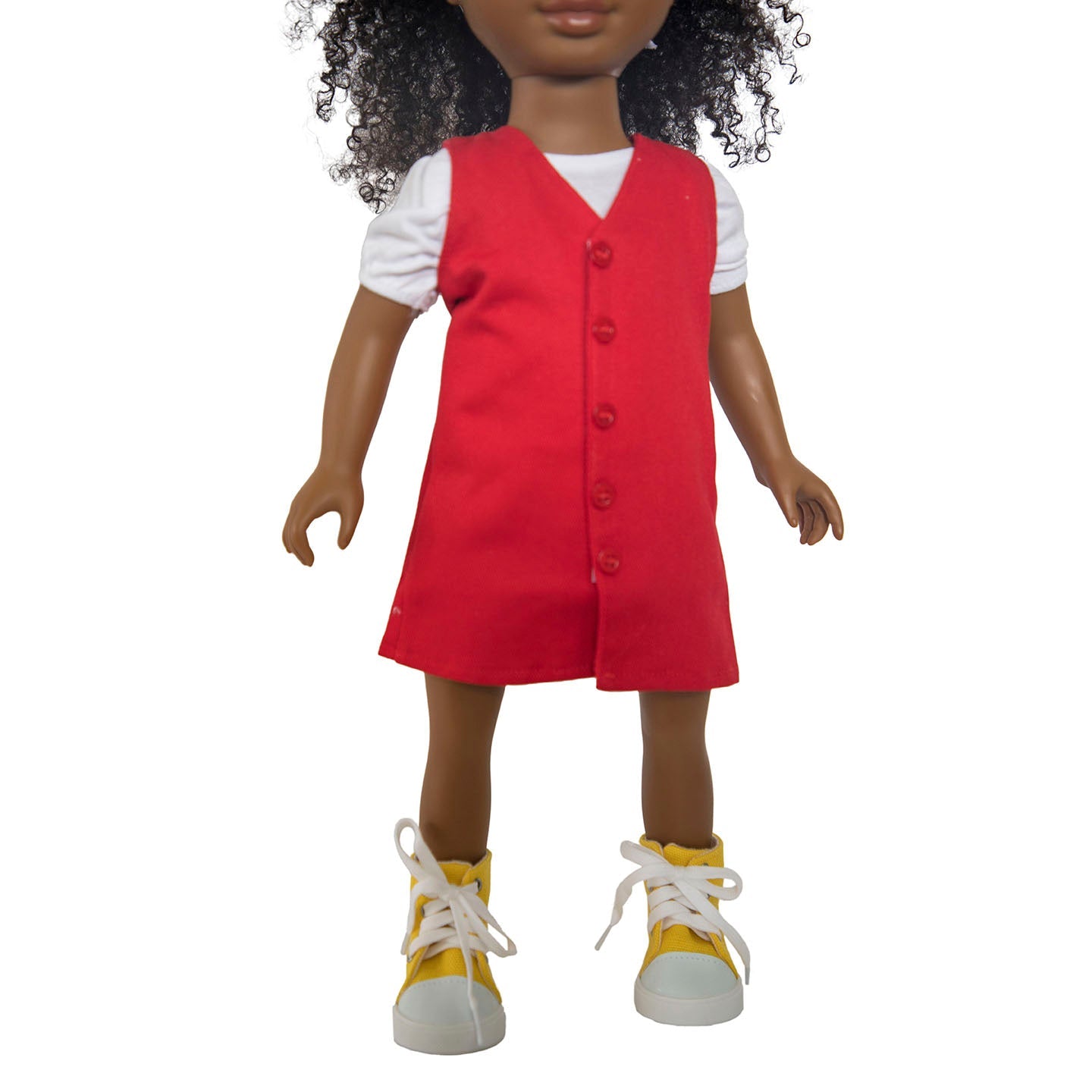 - A sleeveless red dress with buttons